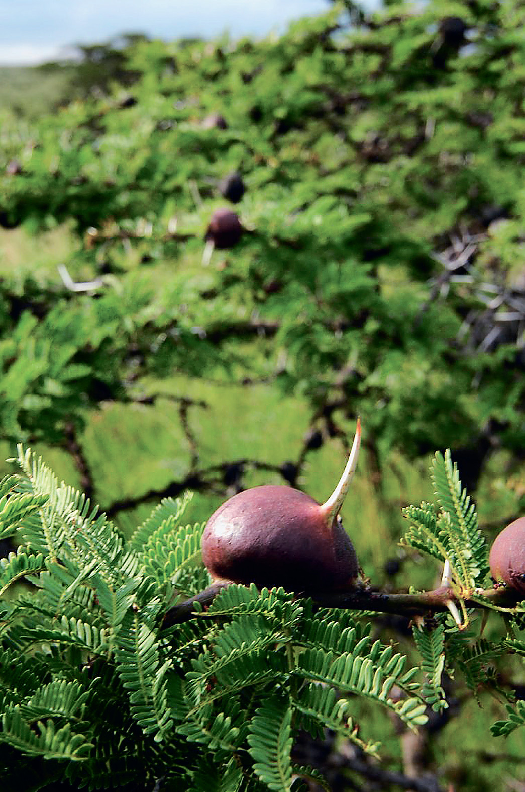 Впечатляющий пример сложности природных взаимосвязей приводит журнал «American Scientist» (США). В саваннах Восточной Африки распространена акация серполопастная (Acacia drepanolobium), с ней в симбиозе живут муравьи рода Crematogaster. Акация, которой в этом регионе покрыты сотни гектаров, обладает двумя типами шипов: простые тонкие колючки длиной по 5 см и вздутые шарики диаметром по 2—3 см с короткой колючкой на вершине (см. фото). Первый тип колючек даёт защиту от жвачных, в основном антилоп, склонных поедать это растение. Второй предоставляет приют надёжным защитникам — кусачим муравьям. Муравьи прогрызают отверстие в шарике и поселяются внутри него. Пустотелый шарик с отверстием превращается в свисток, издающий специфический звук при каждом порыве ветра, поэтому местное население называет эту акацию свистящим деревом. При малейшей опасности для дерева его защитники в больших количествах вылезают из укрытий и располагаются на ветках и листьях, брызгая едкой муравьиной кислотой в желающего полакомиться акацией. Взамен в специальных желёзках у основания листьев дерево вырабатывает нектар, подкармливая своих защитников. Такая оборона не отпугивает разве что слонов, колючки и муравьи для которых — мелкие неприятности, разжуют и не заметят. Но и слоны, попробовав серполопастную акацию раз-другой, замечают, что с листьями в хобот попадают муравьи, больно кусающие его нежный внутренний эпителий.