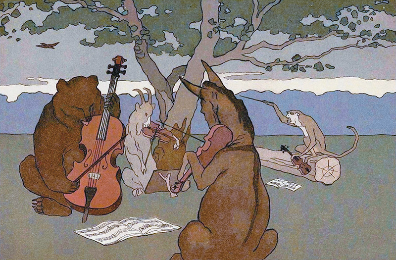 Вы конечно же помните басню Ивана Андреевича Крылова «Квартет» про четверых горе-музыкантов, где проказница Мартышка, Осёл, Козёл и косолапый Мишка затеяли пленить своим искусством свет. Достали инструменты, ноты, ударили в смычки, а толку нет. Попробовали сесть и так и этак, да ничего у них не вышло Вердикт эксперта Соловья был неумолим:
