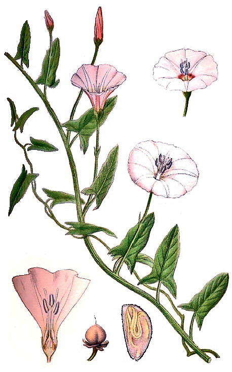 Стебель вьюнка тонкий, с продольными гранями, может достигать в длину более 1 м. Очень прочный на разрыв, словно крепкая веревка. Опору обвивает плотно, и снять с неё вьюнок не так-то просто. В этом автор статьи убеждался много раз при сборе растения в гербарий. Аккуратное отделение вьюнка от несущего побега, да так, чтобы не повредить листья и цветки, зачастую превращалось в довольно кропотливую работу.