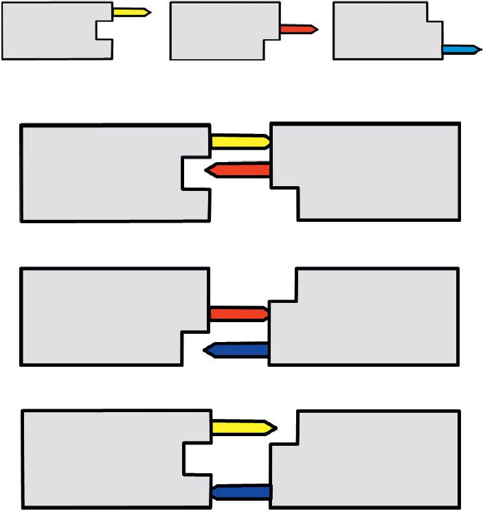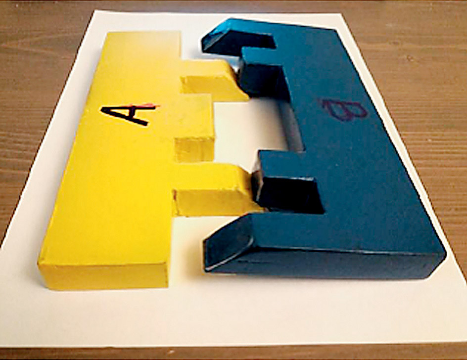 Нетранзитивные гребёнки. Кончик фломастера напоминает клин. Разовьём идею применения клиньев. Можно ли использовать клин как наклонную плоскость для таких нетранзитивных механизмов, при взаимодействии которых один поднимает другой? Возможный вариант показан на рисунке.