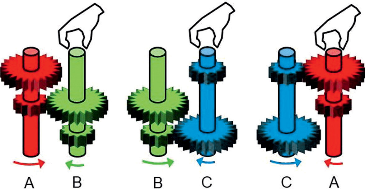 Нетранзитивные шестерни. Шестерни — ближайшие родственники рычагов в отношении способа передачи усилия. На рисунке показаны конструкции с бóльшими и меньшими шестернями, закреплёнными на валах на разных уровнях (так же, как в двойных рычагах). При попарных соединениях конструкция А вращается быстрее В в паре А-В, В вращается быстрее С в паре В-С, С вращается быстрее А в паре А-С. Если соединить все три конструкции вместе, вращаться они не смогут — их заклинит.
