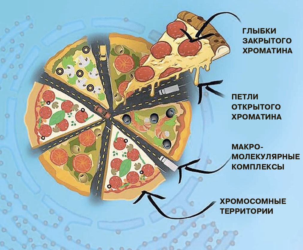В каждый момент жизни клетка использует очень небольшую долю ДНК. Возникает вопрос, как клетка не теряется в массе ненужной информации и как ухитряется держать «под рукой» нужные участки генома. Заглянем в трёхмерную структуру хромосомных клубков и расшифруем пространственные контакты между разными участками ДНК. Точнее, не ДНК, а хроматина — вещества хромосом. ДНК в клетке сама по себе не живёт, с ней всегда связаны разные белки и РНК, и вместе они образуют то, что мы называем хроматином.