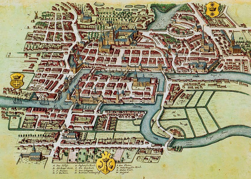 Кёнигсберг (ныне Калининград) возник в XIII веке как три независимых поселения на островах и берегах реки Преголи. Он расположен между Польшей и Литвой на берегу Балтийского моря. Постепенно между поселениями налаживались активные торговые связи (хотя не обходилось и без военных конфликтов), поэтому возникла необходимость более тесного взаимодействия. В XIV веке началось строительство сразу нескольких мостов, и к концу XV столетия их было уже семь. Во многом благодаря мостам три независимых поселения слились в один большой город. Мосты стали его достопримечательностью, на них устраивали празднования, карнавалы, религиозные шествия.