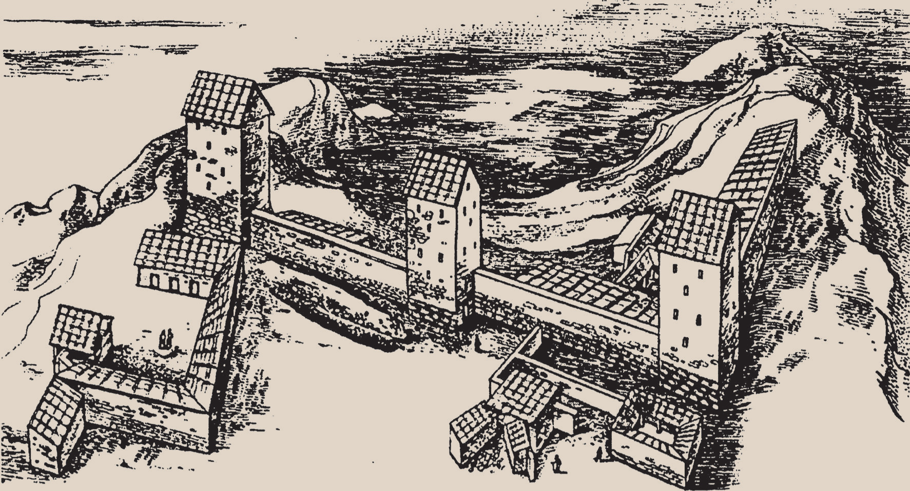 Подступы к этим усадьбам прикрывал форт, а по соседству с ним находились ещё три усадьбы, пристроенные друг к другу. Считается, что они были хозяйственными и обслуживали главный комплекс. У одной из них тоже было крупное зернохранилище.
