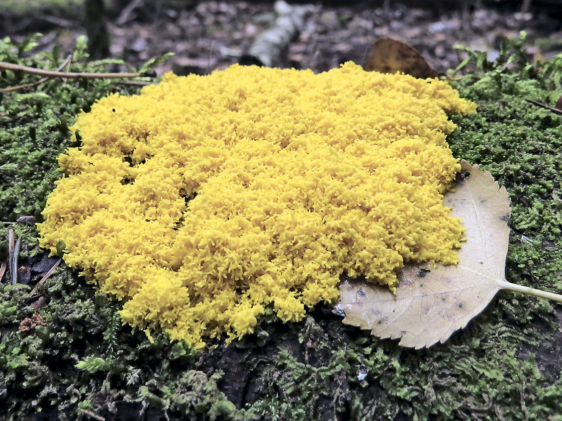 Вряд ли кто равнодушно пройдёт мимо ярко-жёлтого округлого пятна на зелёном мху. Гриб не гриб, на растение тоже не похож. На самом деле — удивительный «грибозверь», представитель класса миксомицетов (Myxomycetes). Современная наука относит их к группе амёбоидных организмов. Они не животные и не грибы, но имеют признаки и тех и других. Подобно грибам — размножаются спорами. Подобно животным способны передвигаться с помощью ложноножек в активной фазе их жизни. Правда, чтобы заметить их движение, придётся сидеть очень долго. Это странное образование, именуемое плазмодием, никуда особо не торопится. Его средняя скорость движения — порядка 6 мм в час. А зачем он вообще куда-то движется? Ищет добычу! Ведь это самый настоящий хищник. Но не пугайтесь: основной пищей ему служат бактерии, одноклеточные водоросли, грибы и их споры. Обнаружив скопление нужной органики, миксомицет подтягивает к ней всё своё тело и наслаждается пищей.