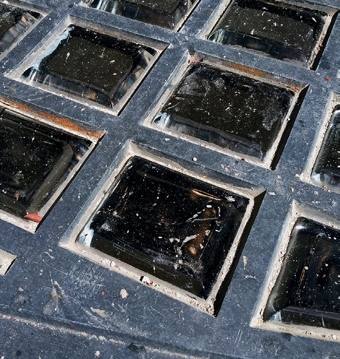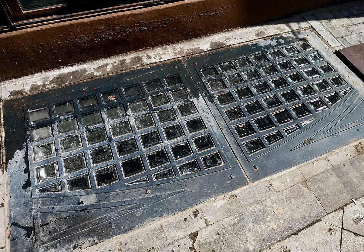 Оглянемся вокруг. Вместо бесконечных столичных пробок улицы заполнены снующими туда-сюда конными экипажами. Значит, мы попали как минимум в первое десятилетие ХХ века, если не раньше. На месте здания, у которого началось наше путешествие в прошлое, идёт большая стройка. Двое рабочих несут ту самую чугунную решётку, ещё без следов ржавчины и с целыми прозрачными стеклянными вставками в форме небольших призм. Она больше похожа на деталь какого-то замысловатого оптического прибора. Прямо на наших глазах решётку укладывают на тротуар над проёмом, сквозь который видны очертания большого подвального помещения. Один из рабочих даже попрыгал на ней, демонстрируя второму прочность конструкции. Подойдя ближе, мы увидели отштампованную в чугуне надпись «Luxfer».