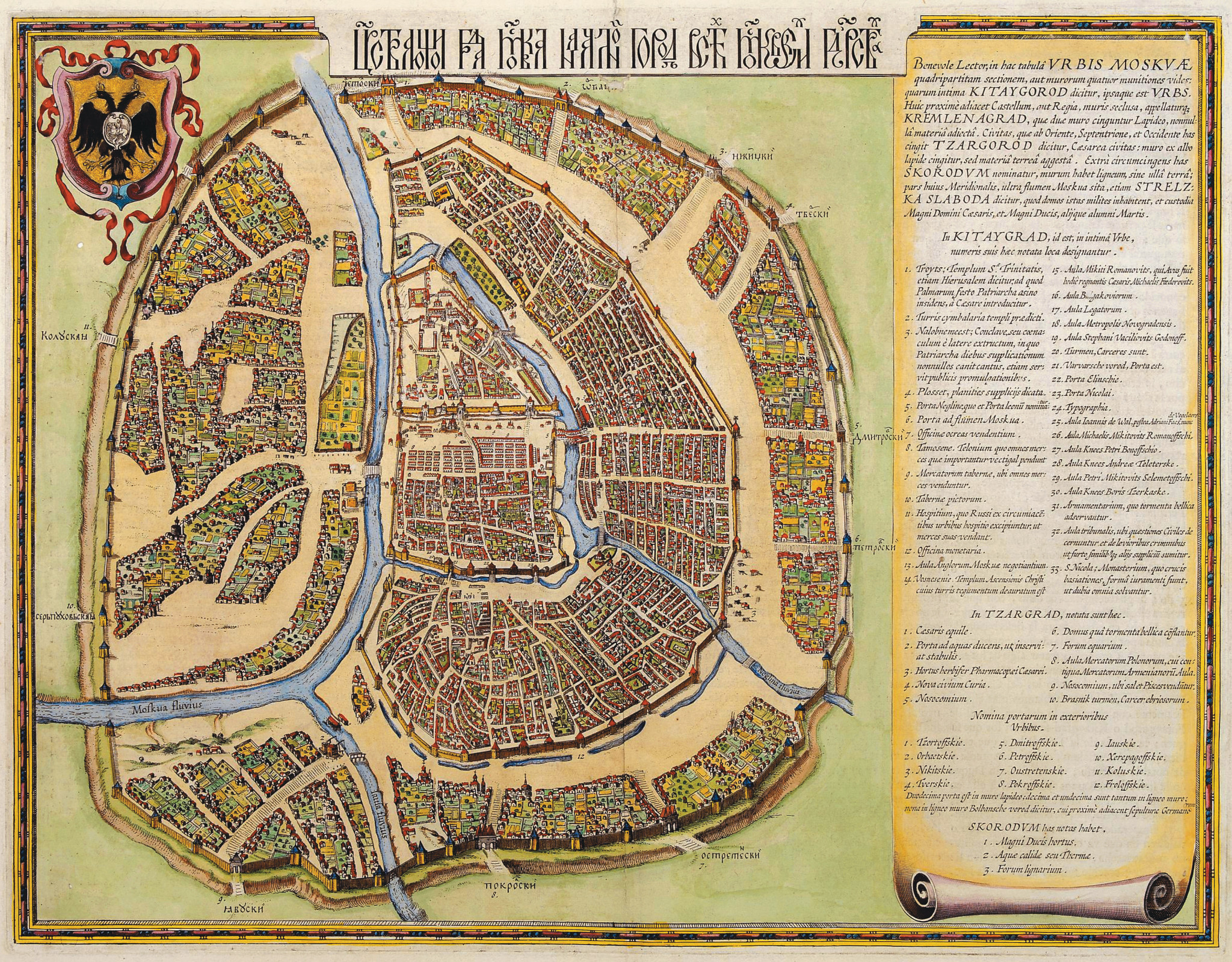 Когда известие об избрании нового царя достигло Амстердама, торговые люди Нидерландов поняли, что пришло время действовать. Можно предположить, что, рассчитывая добиться конкурентных преференций в торговле над своими главными соперниками — англичанами, они решили завоевать расположение московских властей, сделав молодому царю и его вельможам невиданный подарок: комплект гравированных печатных карт Московского государства. У англичан в то время не было ни возможностей, ни сравнимых по классу мастеров, чтобы ответить тем же Гессель Герритц (Hessel Gerritsz, 1581— 1632) — искусный гравёр и автор исследовательских трудов о северных землях, написанных на нидерландском и французском языках, — недаром пользовался репутацией выдающегося картографа. В течение 1613 года он на основании доставленных Исааком Массой материалов и других находившихся в его распоряжении источников подготовил и выгравировал три карты Московского государства в формате фолио, то есть в полный печатный лист: генеральную карту страны с врезкой плана Москвы — Tabula Russiae, а также детальный план Москвы и парный ему план Московского Кремля. И генеральная карта, и детальные планы были посвящены Великому государю Михаилу Фёдоровичу. Эти карты считаются жемчужиной нидерландской и мировой картографии7.