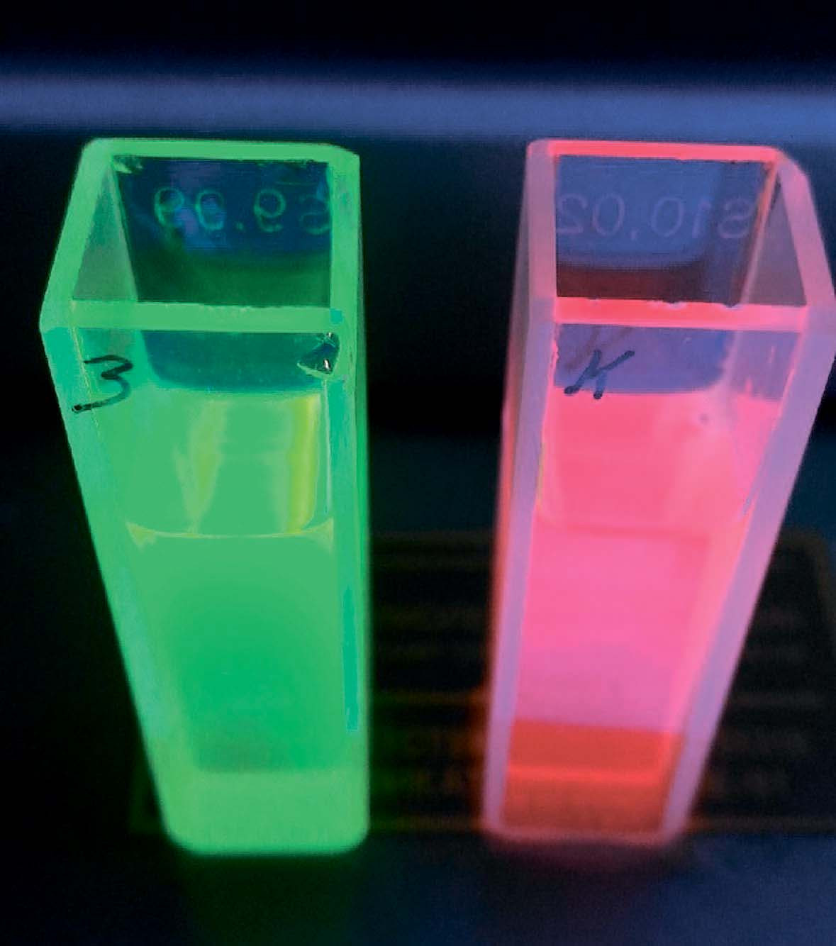 Квантовая точка ведёт себя и не как один отдельный атом, и не так, как это делает большой кусок того же самого вещества, в котором атомов уже миллионы миллиардов. С квантовыми точками это работает иначе. Маленькая точка и точка чуть пожирнее, то есть побольше размером, но состоящая из одних и тех же химических элементов, ведут себя немного по-разному. Например, маленькая точка будет светиться синим цветом, а та, что побольше, в тех же самых условиях — красным. С квантовыми точками исследователи словно получили дополнительное химическое измерение, оставаясь в рамках всё той же таблицы Менделеева.