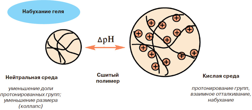 pH-чувствительные полимеры содержат способные к ионизации (ионогенные) группы. Это кислотные (например, карбоксильные или сульфогруппы) или основные группы (аминогруппы). При изменении pH среды и, соответственно, степени ионизации групп полимера существенно изменяются его свойства: конформация (форма), размер и растворимость. рН-чувствительные гидрогели представляют собой трёхмерную сеть из полимерных цепей, химически или физически связанных друг с другом. Они не растворяются, а лишь набухают в водных средах. Это свойство гидрогелей может быть использовано для создания различных тест-систем и получения контейнеров для доставки биоактивных веществ, высвобождающих лекарства при определённых значениях водородного показателя. Гидрогели не только выполняют функцию матрицы, которая дозированно высвобождает лекарство при определённых условиях, но и служат защитной оболочкой.