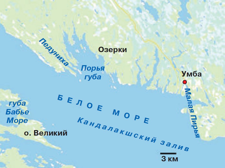 На беломорских берегах много заливов на разных стадиях изоляции, потому что земная кора здесь поднимается со скоростью 3—4 мм в год и водоёмы быстро эволюционируют. Переезжая от одного к другому, можно увидеть разные стадии изоляции, словно перемещаешься на машине времени. Есть ещё не отделившиеся заливы — в них, благодаря приливно-отливным течениям, вода хорошо перемешана, и ковшовые губы*, в котловинах которых вода круглый год сохраняет отрицательную температуру и где обитает арктическая фауна. Есть глубокие солёные лагуны с ослабленным водообменом и застойной сероводородной зоной возле дна, а также озёра, уже утратившие связь с морем, в которых верхний слой опреснён, а в котловине сохраняется реликтовая солёная вода. На самой глубине, где нет кислорода, но есть сероводород, возникает бактериальное сообщество, подобное тем, что царили на Земле миллиарды лет назад, до того как атмосфера стала кислородной. А между сероводородной зоной и верхней кислородной в водоёмах такого типа обычно появляется ярко окрашенная прослойка с самыми древними фотосинтезирующими бактериями, которые вместо воды используют сероводород и выделяют не кислород, а серу.