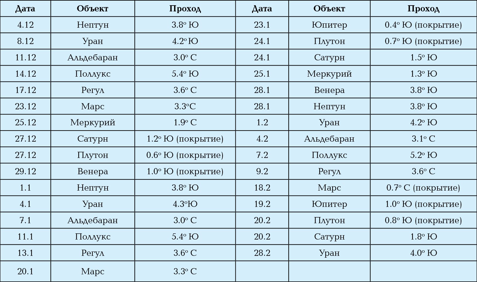 Прохождение Луны рядом с астрономическими объектами (Ю — южнее, С — севернее)