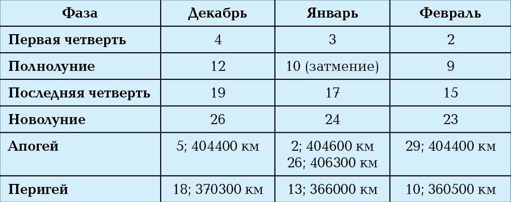 Из астероидов самой яркой будет Веста, путешествующая зимой по созвездиям Кита и Овна, границу между которыми она пересечёт около 20 января. Видна Веста всю ночь до утра. Высота над горизонтом достигает 46о, а блеск в течение месяца меняется от 6,8m до 8,2m. Бывший астероид № 1 Церера, а теперь карликовая планета, перемещается очень низко над горизонтом по созвездию Стрельца, с 29 января — по созвездию Козерога. 20 декабря она будет вблизи звезды Нунки (σ Стрельца, 2,05m). Блеск Цереры остаётся около 9m.