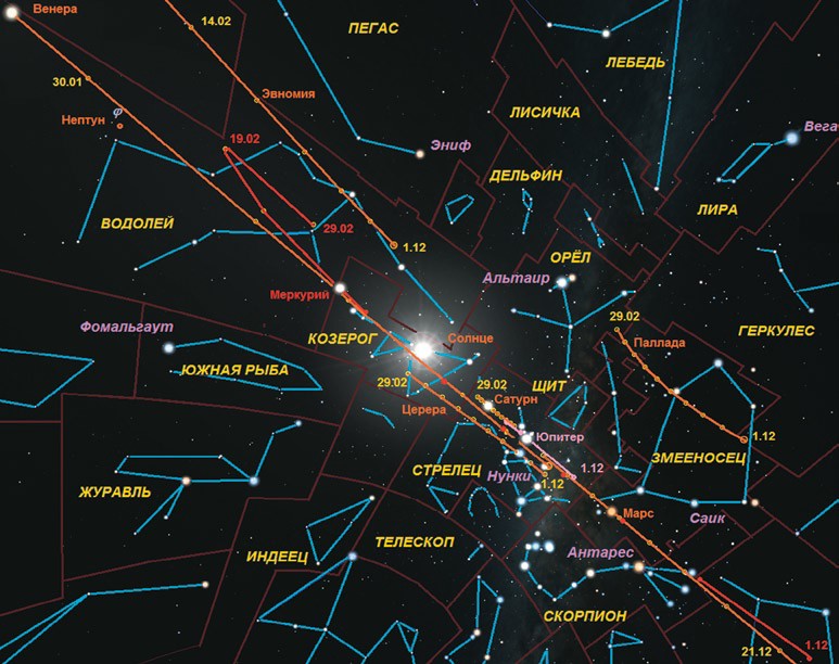За три месяца зимы неутомимый Меркурий успеет побывать в шести созвездиях, следуя за Венерой. Первый месяц зимы он встретит в самой середине четырёхугольника Весов, но уже 11 декабря на три дня заглянет в созвездие Скорпиона, после чего продолжит перемещение по созвездию Змееносца, 16 декабря пройдя в 5о севернее Антареса (α Скорпиона, 1,05m, M1), а затем переходит в созвездие Стрельца (с 27 декабря) и Козерога (с 16 января). Завершит свой путь в созвездии Водолея, границу которого пересечёт 1 февраля. Немного не добравшись до Нептуна и созвездия Тельца, Меркурий после стояния 16 февраля развернётся в обратную сторону, так и не догнав Венеру. Правда, месяцем ранее он повстречается с другими планетами, пройдя 2 января в 1,5о южнее Юпитера, а затем 12 января в 2о южнее Сатурна, причём в этот момент между ними окажется Плутон.