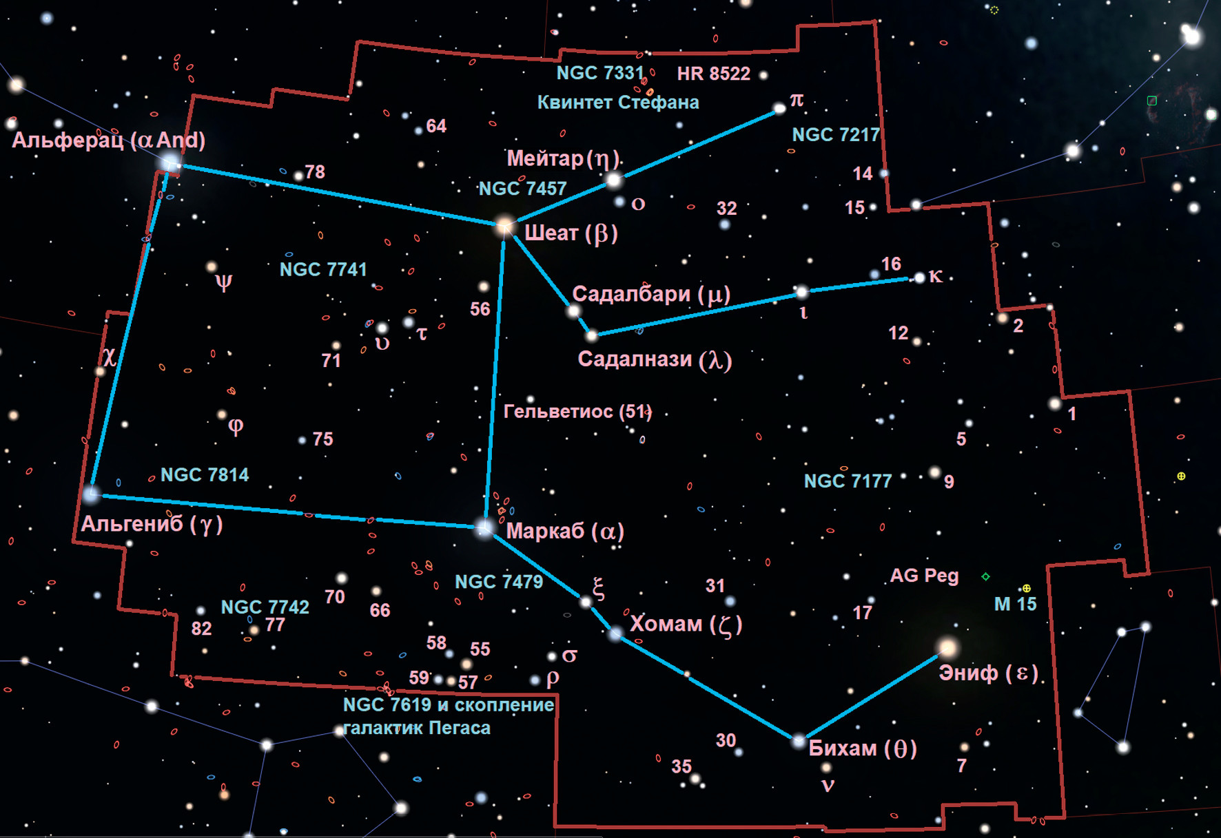 Между α Peg и β Peg расположена звезда 51 Peg (5,46m) — первая солнцеподобная звезда (G2, 1,1 M☉, 1,2 R☉, 1,4 L☉, 5768 K, 50 св. лет), у которой в 1995 году была обнаружена экзопланета — горячий юпитер 51 Peg b. За это открытие астрономы Мишель Майор и Дидье Кело в 2019 году были удостоены Нобелевской премии по физике (см. «Эволюция Вселенной и открытие первой экзопланеты», «Наука и жизнь» № 11, 2019 г.). С 2015 года звезда носит название Гельветиос, а планета — Димидий.