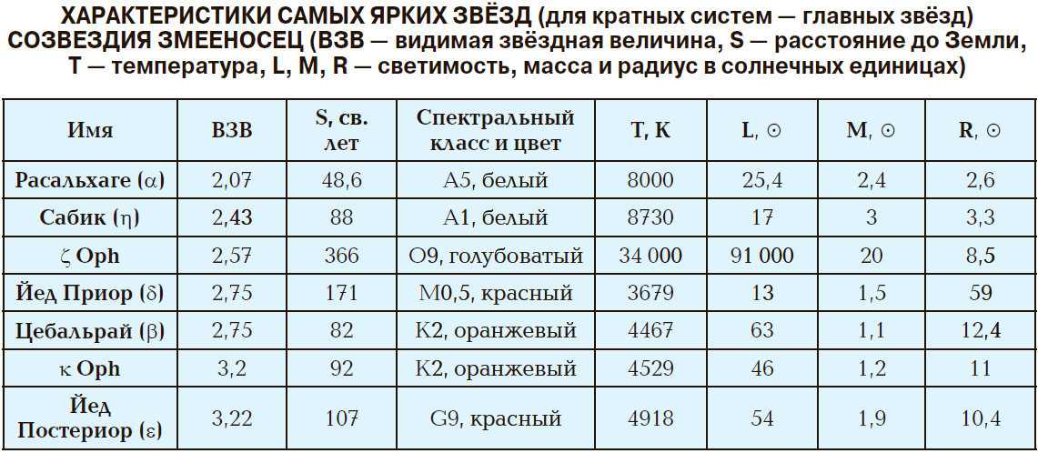 Самая яркая звезда созвездия Расальхаге (α Oph) — быстро вращающаяся гигантская звезда. Скорость её вращения на экваторе 240 км/с, что составляет приблизительно 88,5% от скорости, при которой звезда должна распасться. Это придаёт ей форму сплюснутого шара, экваториальный радиус которого примерно на 20% больше, чем полярный. Расальхаге имеет вторичный компонент — звезду K-типа. Её параметры орбиты (период обращения 3148,4 дня) и массу (0,85M☉) удалось определить только в 2011 году с помощью адаптивной оптики.