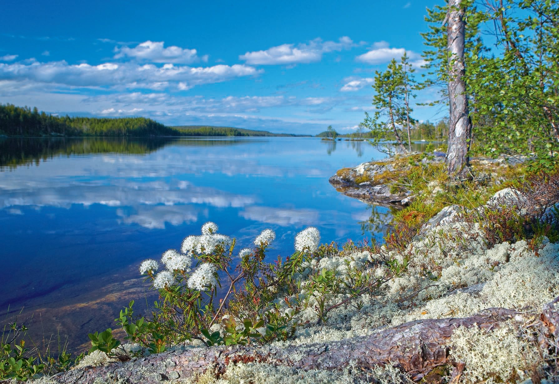 Миную Петрозаводск и еду по удобной, ровной автотрассе федерального значения «Кола». Вдоль дороги, за высоченными золотистыми стволами карельских сосен, блестят ровной водной гладью озерки, бурлят пеной рокочущие реки и речушки. Палитра разноцветных болот, подступающих порой к самому полотну трассы, уступит по яркости только заходящему за горизонт солнцу — огромное, оно висит прямо по ходу движения и красно-жёлтым светом заливает берега больших рек. Они только что освободились от ледяных оков, а по тихим речкам ещё плывут ледяные «тумбочки», похожие на отражения облаков в ослепительно синем небе. Таков северный май.