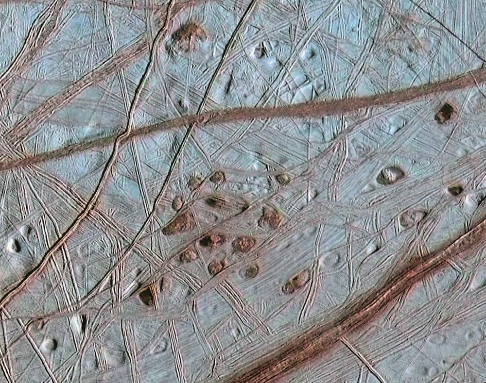 Однако на Европе «не всё гладко», как может показаться на первый взгляд. Её светлая поверхность вдоль и поперёк исчерчена рыжевато-коричневыми полосами. Линии причудливо пересекаются и создают своеобразный абстрактный узор. Но это не просто художества природы — это разломы и трещины в ледяной коре, причём некоторые из них опоясывают Европу почти по кругу. Подобную структуру можно встретить лишь на просторах ледяного покрова Северного Ледовитого океана. Система трещин образовалась на Европе из-за растрескивания коры в результате всё той же внутренней активности. Не стоит близко к ним приближаться, ведь их глубина может достигать сотен метров, а ширина — 20 км!