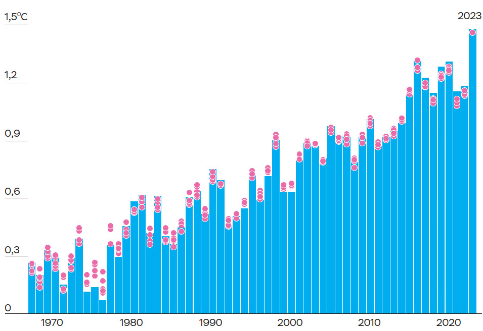 Не дожидаясь официального сообщения Всемирной метеорологической организации, многие уважаемые мониторинговые агентства уже в начале второй декады января стали в своих публикациях оперативно подводить итоги ушедшего года. Обработка и анализ данных наблюдений засвидетельствовали появление нового рекордсмена: по разным оценкам, среднегодовая температура приземного слоя воздуха превысила ее среднее значение за период 1850–1900 годов на 1,34°С (Национальное управление океанических и атмосферных исследований, NOAA), 1,37°С (Национальное управление по аэронавтике и исследованию космического пространства, NASA), 1,46°С (Центр Хэдли Метеорологического бюро Великобритании и Отдел климатических исследований Университета Восточной Англии, HadCRUT), 1,47°С (Японское метеорологическое агентство), 1,48°С (Европейское климатическое агентство Copernicus), 1,54°С (некоммерческая исследовательская организация Berkeley Earth в Калифорнии). Таким образом, нет оснований сомневаться, что прежний температурный рекорд пал, однако каким именно числом будет характеризоваться новый, пока неизвестно: все же имеется немалая (~0,2°С) разница в вышеприведенных оценках, обусловленная различиями в используемых наборах исходных данных, методах интерполяции и коррекции ошибок измерений и пр.