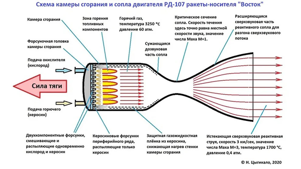 Сначала кислород, а потом и керосин просто самотеком — никаких насосов! — начали сливаться из водонапорной (точнее, топливонапорной) башни ракеты, как вода из крана на первом этаже. И заливать соответствующие полости в двигателях — трубопроводы, расширения, различные каналы, объемы, коллекторы. Наконец, топливные компоненты потекли внутрь камер сгорания, навстречу друг другу. В этих тайных газодинамических пещерах они смешались при выходе из форсунок, и топливной смесью попали прямо на горящую пиротехнику, от которой зажглись мощно и ярко, как и положено керосину с жидким кислородом. Внизу ракеты полыхнуло. Появились клубы огня.