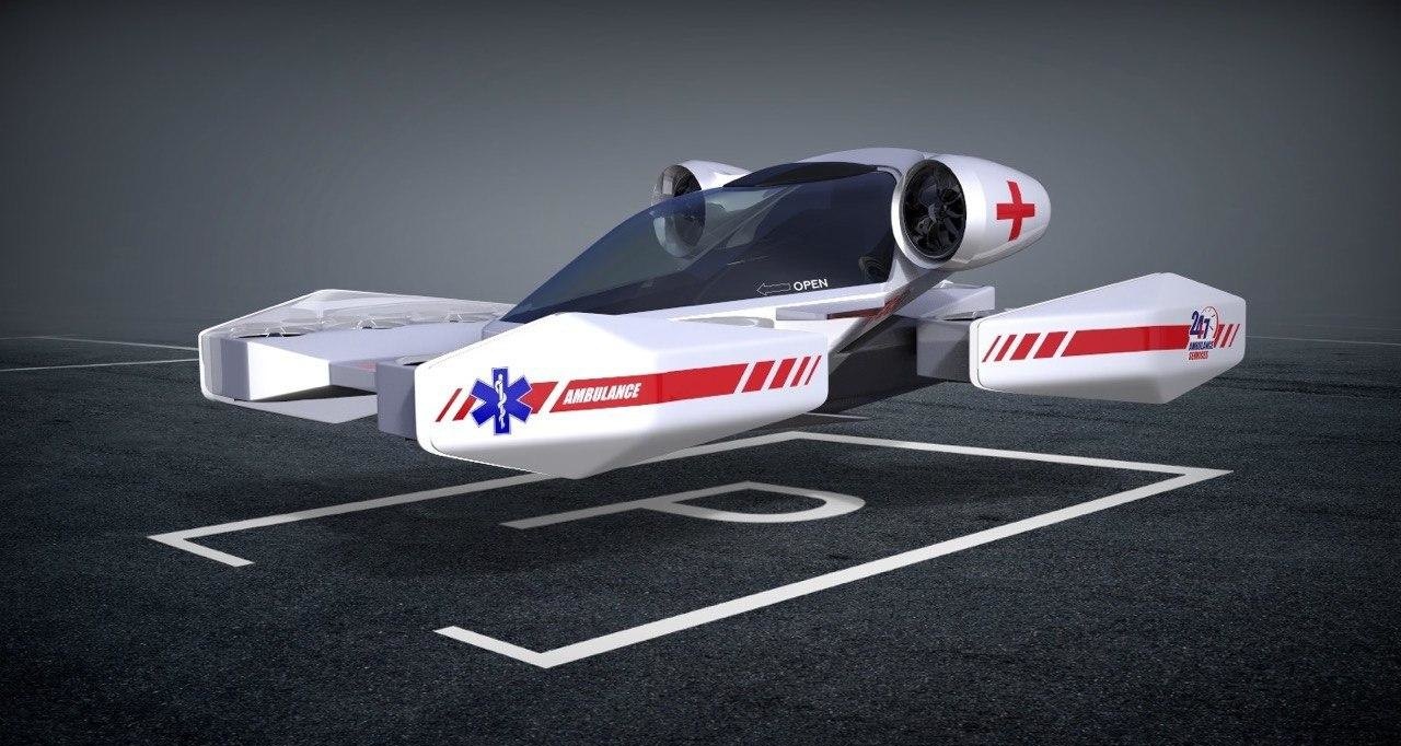 Проект изначально разрабатывался для правительства Дубая, которое очень хочет, чтобы их город стал первым, где официально появится летающие автомобили и мотоциклы — еще три года назад руководитель Hoversurf сам представил полиции Дубая летающий прототип своего летающего мотоцикла Scorpion-3 . Договор о намерении с правительством Дубая, помимо летающих мотоциклов предусматривал и создание двухместного летающего автомобиля, проект которого был сразу разработан в трех беспилотных версиях — полицейский автомобиль, такси и скорая помощь.