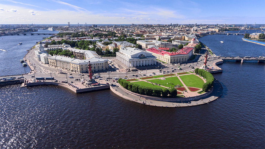 Слева будет виднеться лазурно-белый купол Кунсткамеры Петра Великого — первого публичного музея России. Сверните направо, к стрелке Васильевского острова, — именно с этого места открывается шикарный вид на Неву. Там увидите красные Ростральные колонны, у подножия которых находятся морские божества, олицетворяющие четыре реки: Неву, Волхов, Волгу, Днепр. Раньше колонны зажигали, потому что они выполняли функцию фонарей-маяков.