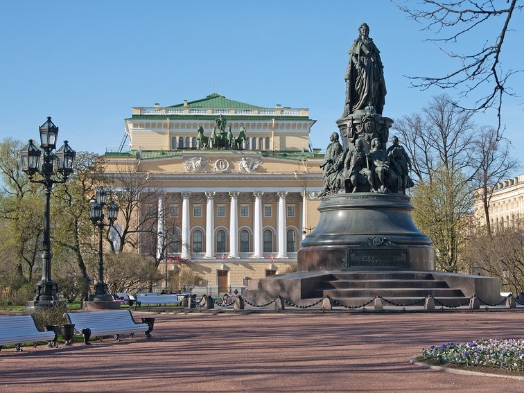 После водной прогулки можно организовать себе мини-квест — найти оригинальные дома на Невском. Например, Елисеевский магазин знаменитой династии купцов — с витражами, скульптурами, витринами. Обязательно зайдите внутрь — там целая гастрономическая страна конфет, пирожных, шампанского. А напротив точно заметите силуэт памятника Екатерине II перед Александринским театром.