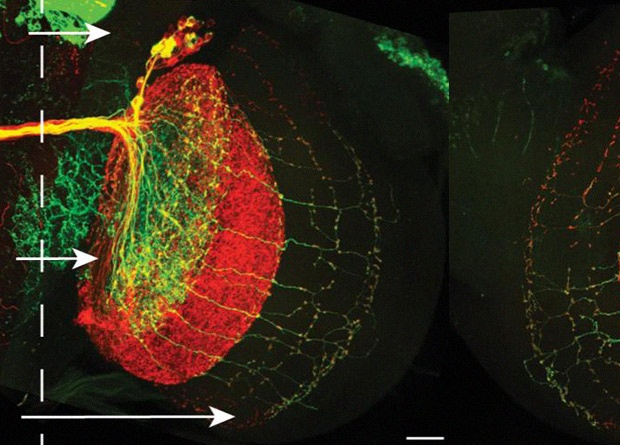 В области мозга дрозофил, которая отвечает за обработку зрительной информации, есть скопление нервных клеток (дорсальный кластер), проекции которых значительно вариабельны между особями и даже между двумя полушариями одной и той же мухи. Аксоны этих нейронов идут в один из двух отделов зрительной системы: медуллу или лобулу. То, куда именно направит свою проекцию каждый отдельно взятый нейрон, обусловлено случайными событиями в процессе его развития.