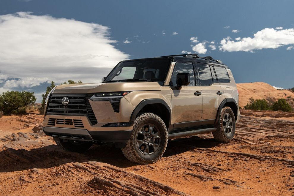 Откровенно говоря, прежний Lexus GX не был привлекательным автомобилем. Он был высоким и узким, что придавало ему какие-то странно сжатые пропорции. В третьем поколении Lexus решил сделать дизайнерский взмах крылом, что, в целом, значительно улучшило ситуацию. Новая квадратная форма отсылает нас к таким автомобилям, как Land Rover Defender и Mercedes-Benz G-класса, а подобные сравнения никогда ещё не звучали в отношении Lexus (кстати, он почти на десять сантиметров шире, чем предыдущий GX). Размеры колёсных дисков начинаются с 20 дюймов в комплектации Premium и доходят до 22 дюймов в Luxury +. В качестве альтернативы, на моделях Overtrail и Overtrail +, позиционируемых как внедорожные, устанавливают более адекватные 18-дюймовые диски с 33-ми вездеходными шинами, хотя смотрятся они, конечно, не так эффектно. Да, у версии Overtrail ещё и немного увеличен дорожный просвет – с 220 до 225 мм.