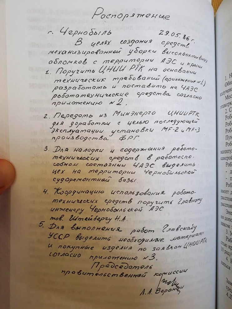 Уже через несколько дней к работе был привлечен ЦНИИ РТК, главный в СССР центр робототехники. Он получил задание: до 15 июня 1986 года разработать и поставить на ЧАЭС подходящие машины. Из-за спешки распоряжение председателя правительственной комиссии Льва Воронина, датированное 29 мая 1986, было написано от руки.