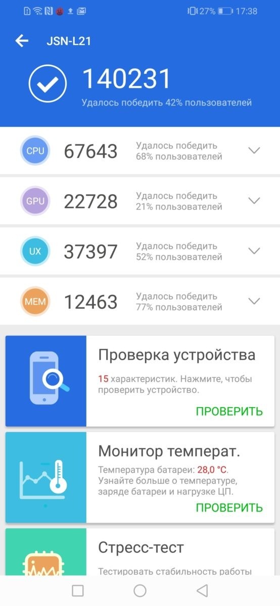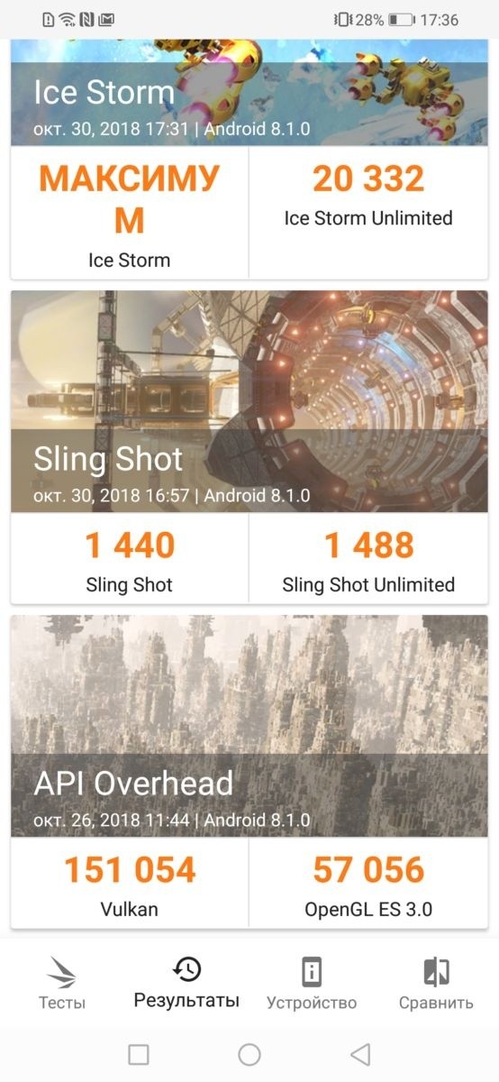 Honor 8X работает на 12-нанометровом процессоре Kirin 710 поколения Cortex-A73. Графический чип Mali G51 поддерживает технологию GPU Turbo, которая увеличивает игровую производительность, гарантирует стабильную отрисовку кадров и снижает энергопотребление. Проще говоря, смартфон хоть и не позиционируется как игровой, но отлично подойдет для запуска 3D-игр вроде WoT: Blitz или Injustice 2. В честь этого мы прогнали на Honor 8X не только AnTuTu, но и 3D Mark. Результаты тестов на скриншотах.Уже в базовой версии Honor оснащен 4 Гбайт оперативной памяти, а вот конфигурацию хранилища можно выбрать – 64 или 128 Гбайт. Мы тестировали топовую сборку, но если вы решите взять гаджет с 64 Гбайт, то все равно сможете добавить ему памяти с помощью microSD (до 400 Гбайт). При этом не придется жертвовать второй SIM – в слот можно одновременно установить две симки и карту памяти.