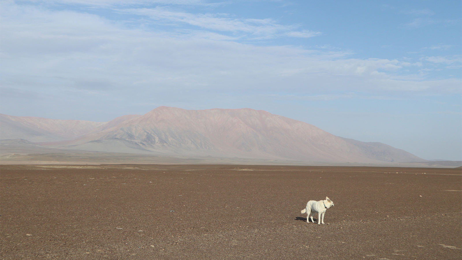 Пустыня в южной части Перу отличается от северной: более нежная, ровная, спокойная, мягкая. Слева наблюдаю череду небольших холмов в пастельных оттенках. А вот возвышается розовая гора на фоне голубого неба с белесой дымкой, перед ней расстилается песочная гладь.