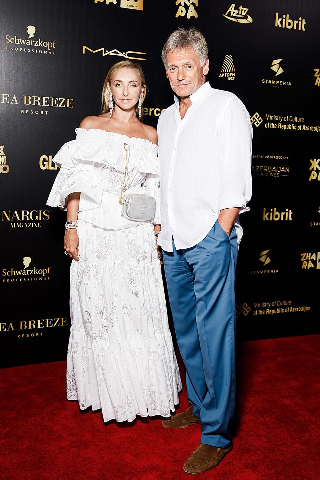 Одной из самых обсуждаемых пар вечера стали Татьяна Навка и Дмитрий Песков. Знаменитая фигуристка выглядела великолепно: на ковровой дорожке она позировала фотографам в белом платье из кружева с открытыми плечами. Вместе с мужем она задержалась в Баку на несколько дней.