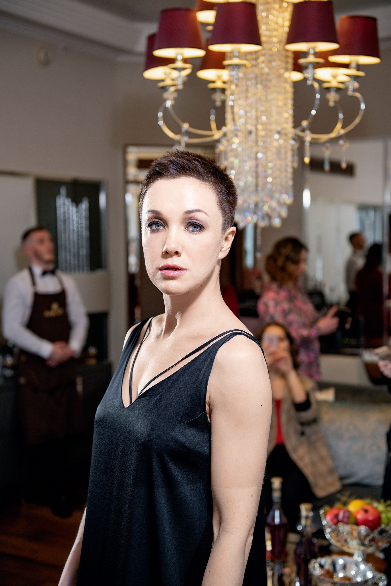 Чтобы придать волосам Александры гладкость и мягкость, Марина Сорокина, ведущий стилист марки Charles Worthington, использовала шампунь и кондиционер с протеинами. Локоны Александры она закрепила фиксирующим спреем для сияния. Образ с акцентом на губы главный визажист Artistry Анна Синица создала при помощи увлажняющей тональной основы, скульптурирующих румян, черной подводки и красного блеска для губ. В завершение Ольга закрепила макияж актрисы матирующей пудрой.