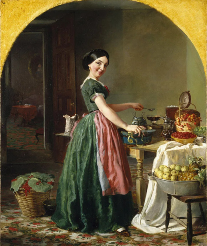 В основном Лилли писала портреты и натюрморты, а еще уделяла много внимания образу женщины и ее роли в обществе. Например, героиня этой картины, занятая вроде бы домашними хлопотами, явно флиртует с тем, к кому обращено название «Попробуй, поцелуй — получишь патокой!». Женщины на ее жанровых полотнах занимаются делами, приличествующими жене и матери, но их жовиальность меньше всего соответствует скромному идеалу «ангела в доме».