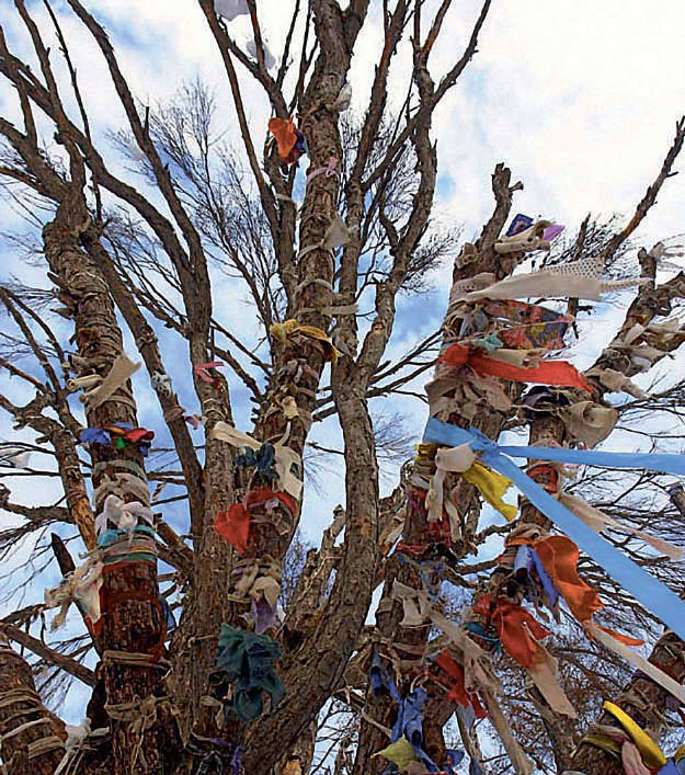 А вот повязывание разноцветных ленточек верующими в духов алтайцами имеет для них большое сакральное значение. Если сравнить с обрядами в православии, это как поставить в церкви свечку. Обрядовые священные ленточки называются дьалама и входят в список нематериального культурного наследия республики. Они изготавливаются из ткани специально для молящегося: ширина меряется по ширине двух сложенных пальцев, а длина – по длине вытянутой руки. Ленточки бывают четырех цветов – желтые, голубые, белые и зеленые – и обозначают поклонение трем мирам: верхнему – небесному, среднему – миру людей и нижнему – матери-земле. Повязывают их, как правило, на ветвях деревьев и кустарников на перевалах, у целебных источников, на переправах рек в знак благодарности и почтения духам.