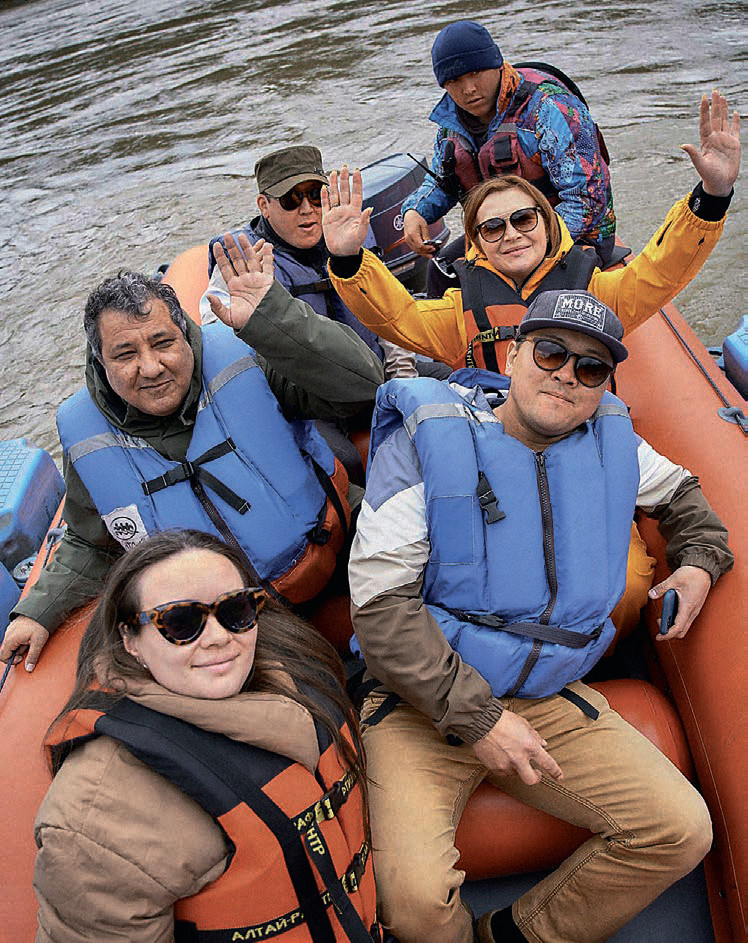 В тот же день мы отправились на главную реку Алтая – Катунь. Протяженностью почти 700 км, порожистая и быстрая река все дни сопровождала нас, то выныривая из-за крутого поворота дороги, то шумя под окнами очередного туркомплекса. Надев спасательные жилеты, на моторафтах мы отправились к Камышлинскому водопаду, по пути получив изрядную дозу адреналина. В эту поездку нам везло не только с погодой: накануне расцвел маральник – главный алтайский кустарник с цветками нежно-розового цвета.