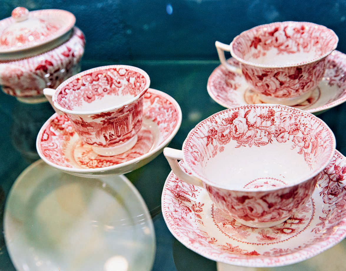 На витрине выставлены расписные фарфоровые чашки, хоть сейчас садись пить чай с английской королевой.