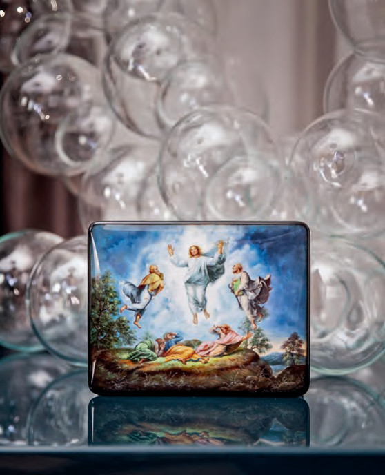 Каждое изделие создается вручную, проходя множество этапов: от лепки папье-маше до многослойной росписи. Работа над каждой шкатулкой занимает от 3 до 6 месяцев. Особенность миниатюры – использование масляных красок и техники письма по сквозному просвету, что придает изображению объем и свечение.