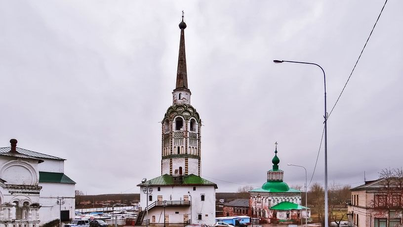 Колокольня в городе Соликамске Пермского края не имеет архитектурных аналогов в России. И дело не только в том, что она отклоняется от оси почти на два метра. 60-метровая колокольня состоит из двух четко различимых частей — массивного куба и высокой восьмигранной башни.