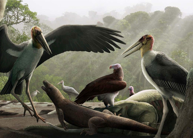 Гигантские марабу Leptoptilos robustus пытаются отогнать молодого комодского варана (Varanus komodoensis) от туши стегодона Stegodon florensis insularis. На рисунке также изображены грифы из рода Trigonoceps. Все эти виды, кроме варанов, вымерли вскоре после появления на Флоресе человека разумного (Homo sapiens). Hanneke J. M. Meijer et al. / Royal Society Open Science, 2022