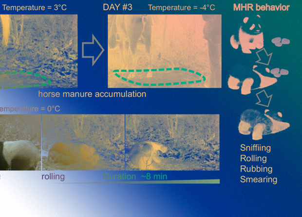 Команда исследователей во главе с Жэнем Лаем (Ren Lai) из Института зоологии в Куньмине решила разобраться в странной привычке больших панд. С июля 2016 по июнь 2017 года ученые разместили инфракрасные камеры-ловушки в местах обитания циньлинских панд и получили 38 записей, на которых как самцы, так и самки этого подвида обмазывались конским навозом. Всякий раз панды сначала принюхивались к найденной куче, затем терлись о нее щекой, после чего катались в помете и распределяли его по поверхности тела. Продолжительность этого поведения варьировалась от шести