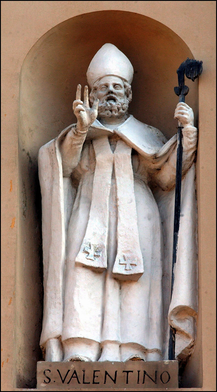 В одном из отчетов 1400-х годов Валентина объявляют священником, которого обезглавили по приказу Клавдия II за то, что церковник помогал парочкам тайно венчаться вопреки запрету императора вступать в брак. По другой версии, Валентин был епископом Интерамны (современного Терни — города в Италии), известным своими чудесными исцелениями и поплатившимся за обращение в христианство сына градоначальника.