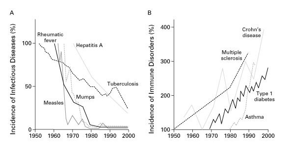 Так или иначе, к 1980-м годам подросло поколение людей, чье детство прошло без дружбы с кишечными паразитами. И врачи заметили, что на смену старым, привычным болезням в этом поколении пришли новые, которые раньше считались редкими. В 1989 году британский эпидемиолог Дэвид Стрэчан подсчитал, что дети не просто чаще стали страдать астмой, аллергией и экземой — они болели ими тем чаще, чем меньше у них было старших братьев и сестер. И эту связь Стрэчан предложил объяснять вовсе не финансовыми обстоятельствами или чувством одиночества. Он заподозрил, что старшие дети служат для младших «негигиеничным контактом» — то есть источником паразитов. А те, в свою очередь, укрепляют иммунную систему малышей и делают ее устойчивой к аллергиям и другим болезням.