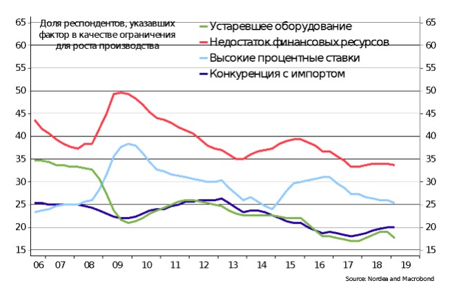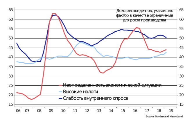 Постоянная угроза дополнительных санкций – это дополнительный источник неопределенности для будущей динамики валютного курса, а как следствие, и инфляции, и процентных ставок. В таких условиях прогнозы становятся менее точными, а инвестиционные решения более рискованными. Опросы компаний подтверждают наличие у бизнеса дискомфорта в связи с неопределенностью экономической ситуации. Лишь слабость внутреннего спроса фигурирует в ответах компаний чаще, чем неопределенность экономической ситуации как фактор, ограничивающий рост бизнеса.