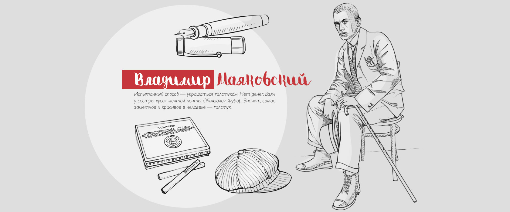 - Папиросы «Герцеговина Флор» и «Северная Пальмира». «Маяковский бросает выкуренную русскую папиросу, закуривает другую и начинает ходить из угла в угол большой меблированной комнаты на Пятой авеню. <…> Вот он — Маяковский! Так же прост и велик, как и сама Советская Россия. Гигантский рост, крепкие плечи, простенький пиджачок, коротко остриженная большая голова и широкая русская ноздря». Из репортажа газеты «Фрайгайт», Нью-Йорк, 1925 год