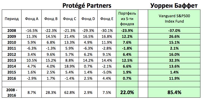 В начале 2007 году Уоррен Баффет публично объявил, что готов держать пари на $500 000, «что никто из профессионалов не сможет составить портфель хотя бы из пяти фондов хедж-фондов, которые за десять лет обгонят по доходности один выбранный им фонд на индекс S&P 500 с учетом всех комиссий и сборов». Он ждал, что выстроится длинная очередь из управляющих фондами хедж-фондов, готовых принять вызов, с предложением включить свой фонд фондов в это пари. Однако время шло, а желающих почему-то не было. Управляющие привлекали в свои фонды фондов тысячи инвесторов и миллиарды долларов обещаниями высоких доходов, но не спешили поставить на кон свои деньги, чтобы доказать всем свое мастерство.