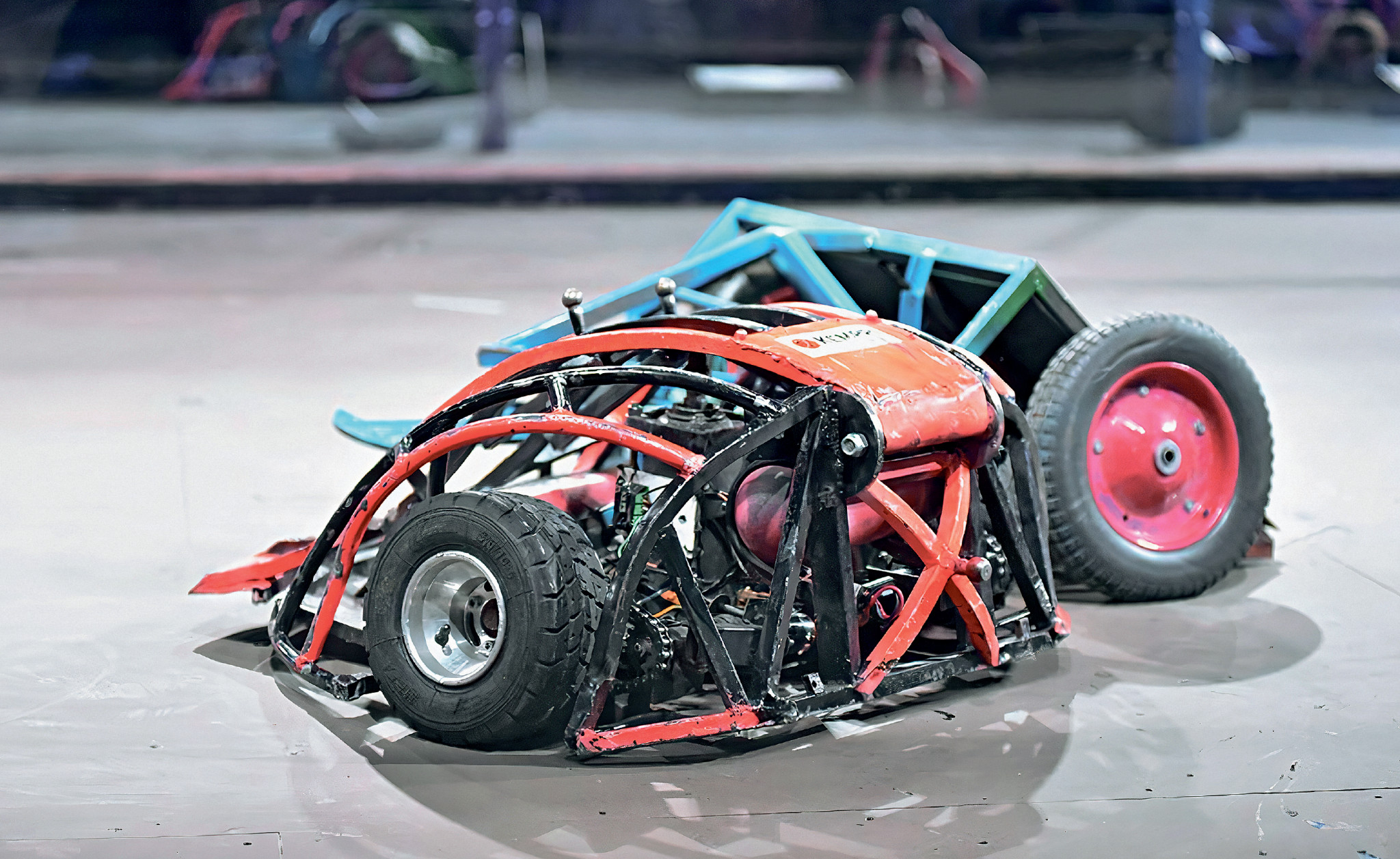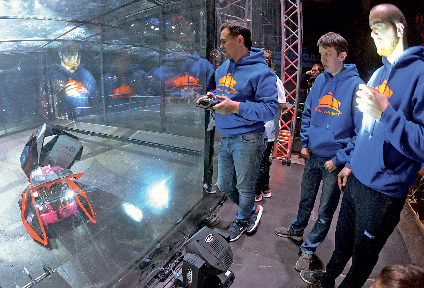 Встречаются роботы, несущие тяжелое ударное вооружение – топор или молот. Как-то в соревнованиях участвовал Thor из Великобритании. Сила неимоверная: промахиваясь, он пробивал насквозь 16-миллиметровую фанеру на полу. Бывают и спиннеры, которые вращаются на огромной скорости. Но самыми разрушительными, пожалуй, являются машины, которые используют зазубренные барабаны, режущие диски или ножи. После одного из боев против такого робота нам пришлось заменить часть стальной конструкции Archy. Он был вооружен острым 20-килограммовым ножом из «вечной» конструкционной стали Hardox, которая используется, например, для ковшей экскаваторов.