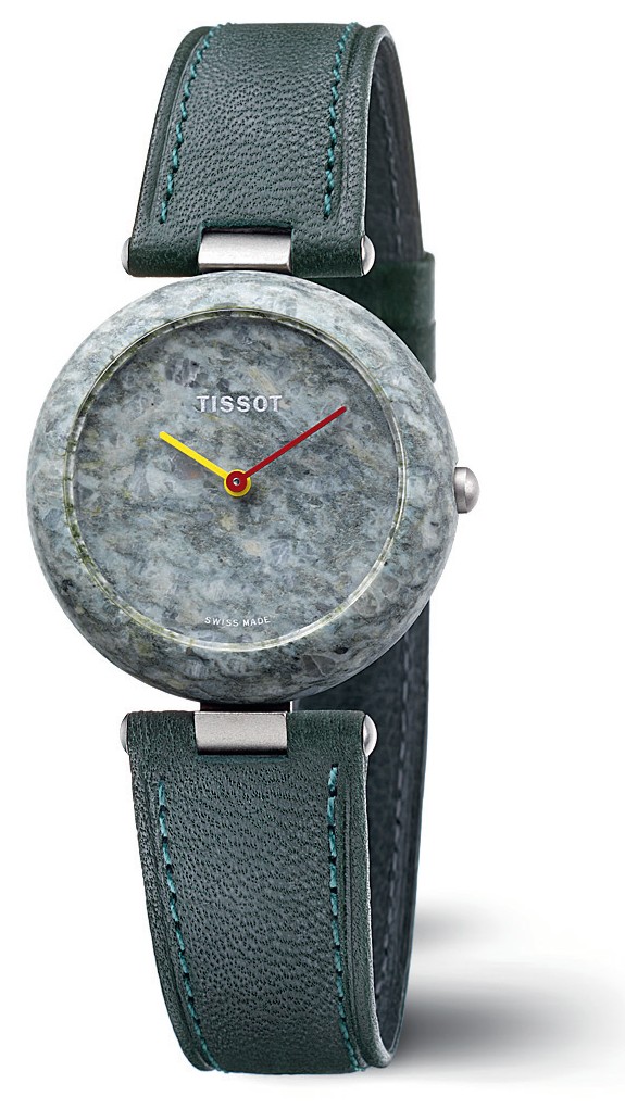 В декабре 1985 года компания Tissot представила сперва на американском, а затем и на мировом рынке серию часов RockWatch, корпуса которых полностью изготовлялись из гранита. Изначально камень добывался в Швейцарских Альпах, в кантонах Гризон, Тичино и Вале, но модель оказалась настолько успешной, что для удовлетворения спроса компания начала завозить полудрагоценные камни и из других регионов. В частности, появились RockWatch из яшмы, скандинавского базальта, австралийского родонита, бразильского содалита, магнезита, тулита и пр. В ранних версиях стрелки были только красными и желтыми – это традиционные цвета, которыми в Швейцарии маркируются указатели на пешеходные тропы. Дизайн всей коллекции разработал известный французский ювелир Робер Мазло. Каменные часы производились вплоть до 1992 года, а их суммарный тираж составил более полумиллиона экземпляров. Технически RockWatch были относительно просты, но вот технологию изготовления корпусов компания разрабатывала практически с нуля, поскольку до Tissot такой практики, особенно в масс-маркете, ни у одной часовой компании не было.
