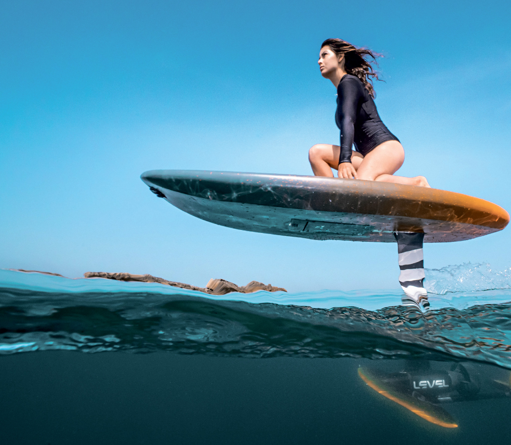 Схема Level Foil напоминает хвостовой стабилизатор самолета с рулем высоты и рулем направления, который для большей эффективности работает в потоке воды от электромотора. Руль направления выполняет две функции: меняет направление и активно корректирует крен. Руль высоты соответственно отвечает за поддержание оптимальной высоты над водной поверхностью: полет ограничен узким рабочим коридором. На борту стоят датчики аэрокосмического класса, интегрированные в бортовой компьютер, который корректирует положение гидрофойла 400 раз в секунду. Ключевой компонент системы – активный датчик высоты, специально сконструированный для суровых условий морской среды и расположенный в носовой части серфа.