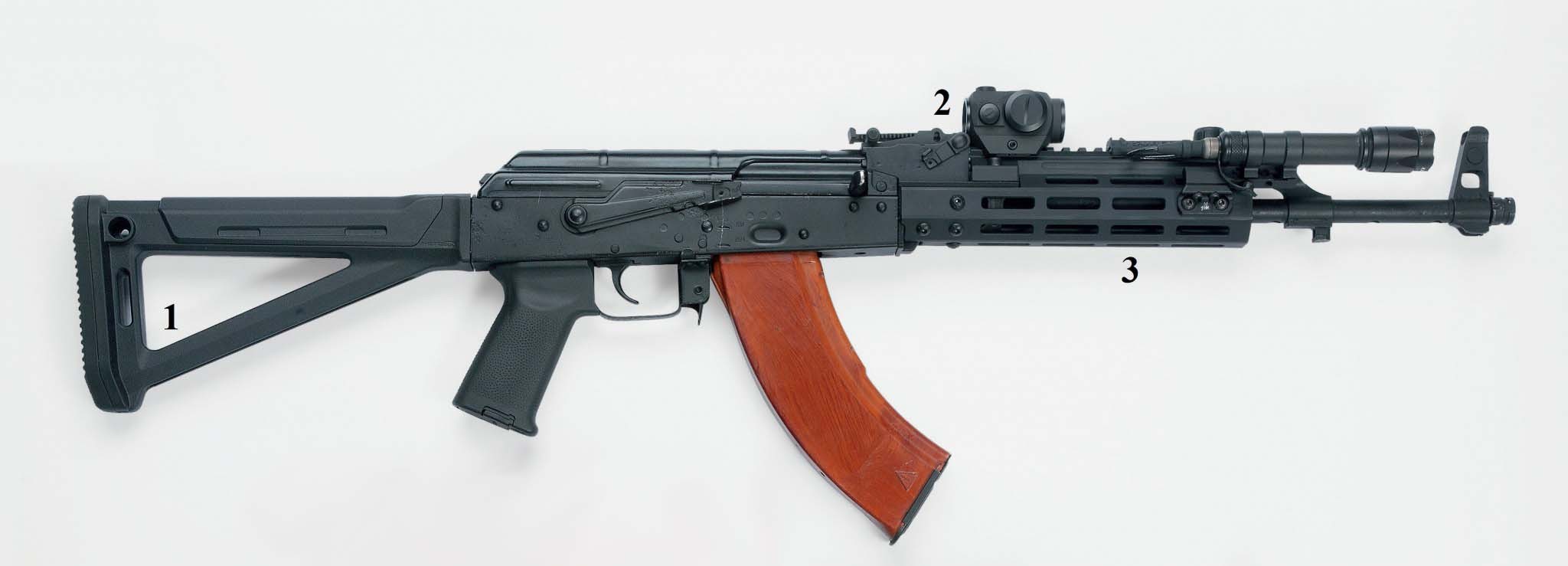 При переходе на промежуточный патрон 5,45 x 39 и смене автомата АК47 на АК74 кучность улучшилась, но воспользоваться этим почти нельзя из-за небольшого количества оптических прицелов под боковую планку «ласточкин хвост», которой обзавелся АК74М. На мировом рынке победил стандарт MIL-STD-1913, он же планка Пикатинни. А построение системы «ласточкин хвост – Пикатинни – прицел» вводит дополнительное промежуточное звено, что не улучшает точности. Поэтому при разработке комплекта апгрейда к АК мы сосредоточились на трех моментах.